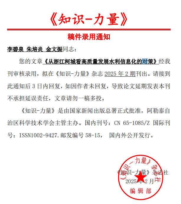 由土木工程系22级学生李碧泉、朱培炎和机械工程22级学生联合金文振联合撰写的论文《从浙江柯城看高质量发展水利信息化的对策》被新疆阿勒泰自治区科学技术学会主管和主办的《知识-力量》杂志录用,并将于2025年2期刊出。
