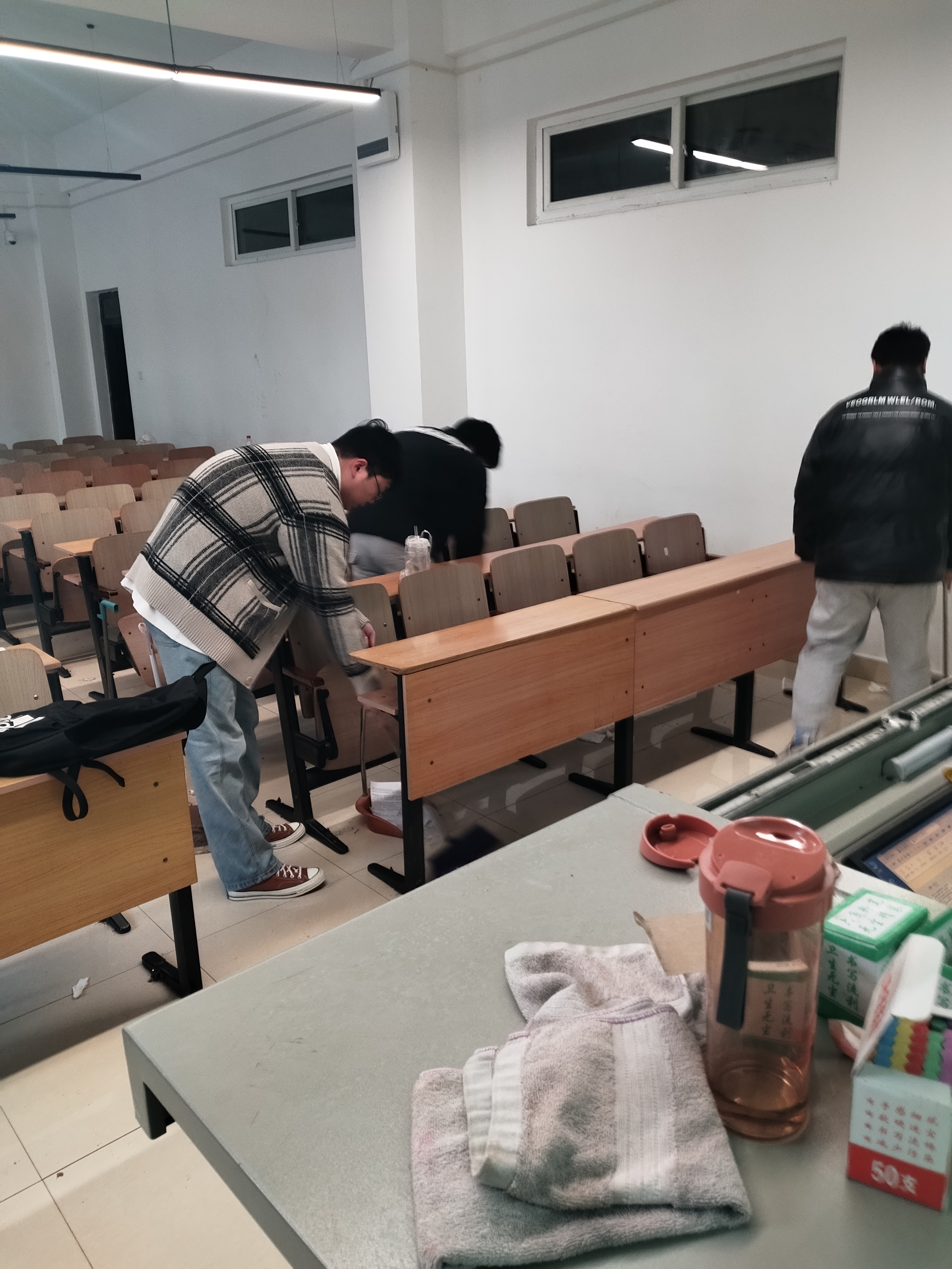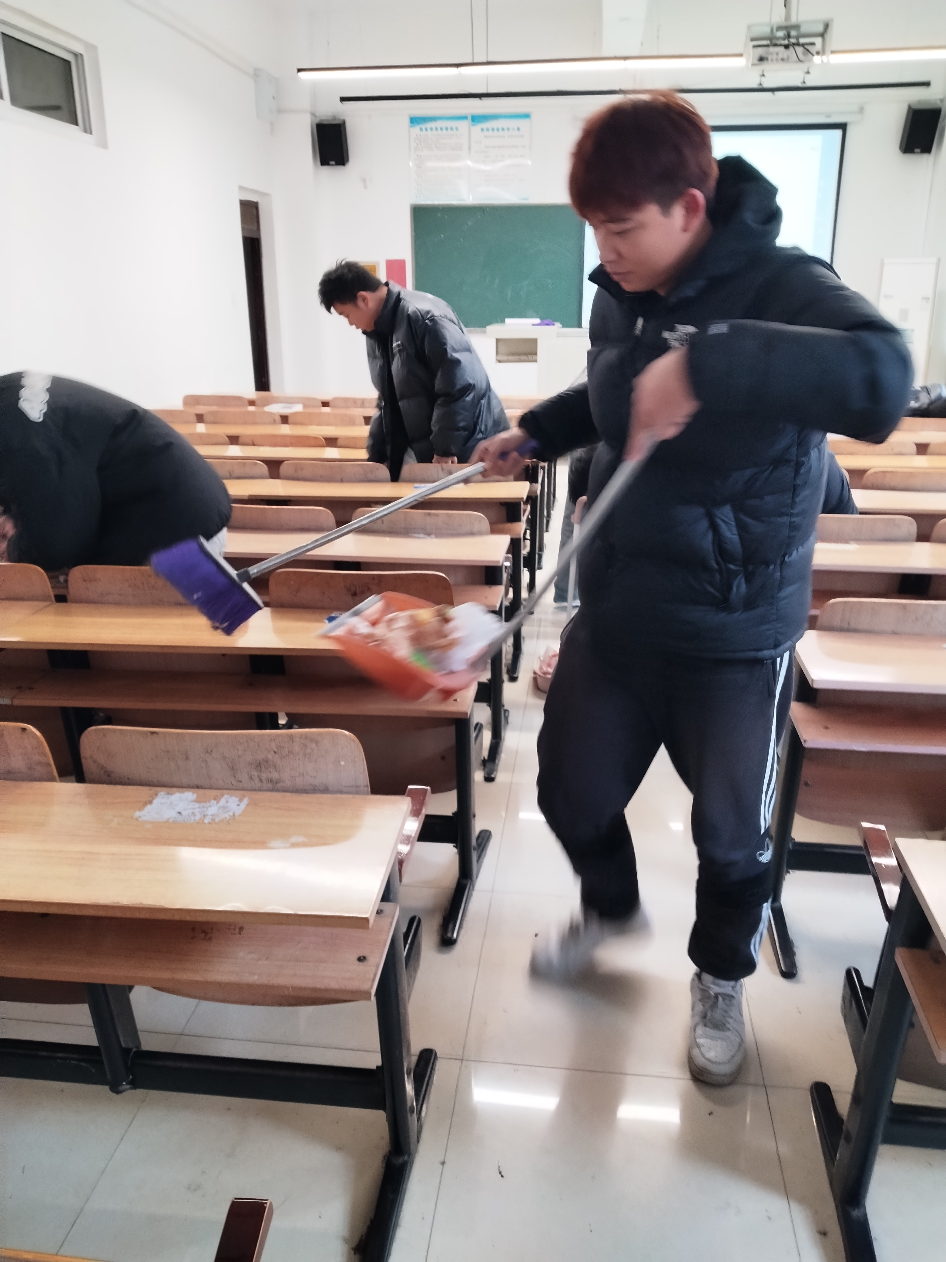 本网讯(通讯员尚海静 徐卫国 郑洁)2025年02月26日早晨,龙振华老师和平时一样提前到来到教3-322教室,眼前却出现了和往日不一样的场景,只见教室灯光通亮,几个学生在打扫教室卫生,清理课桌上的矿泉水瓶。