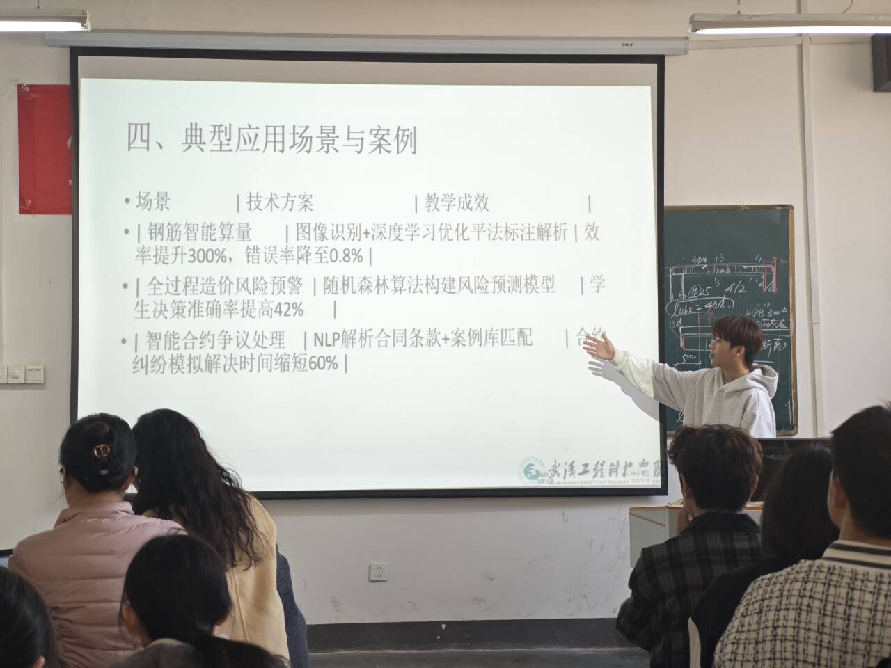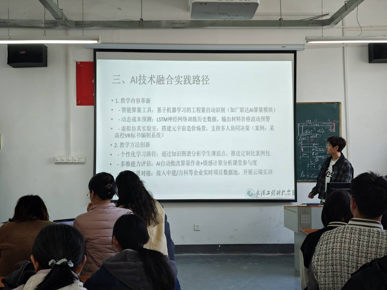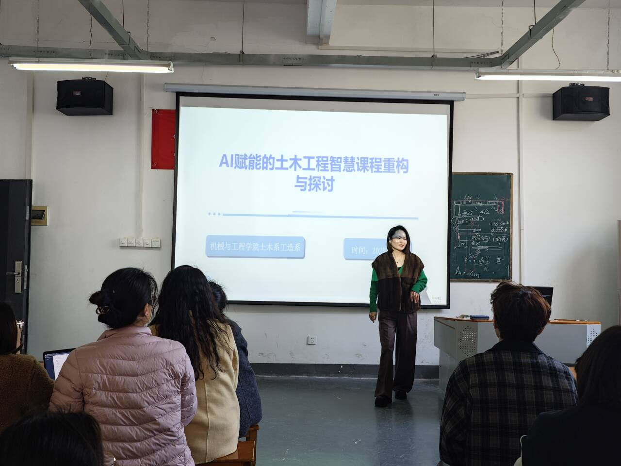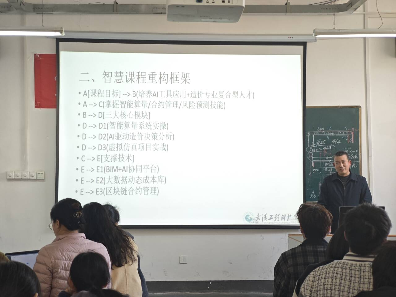 本网讯(通讯员梅鸿儒 纪仁芹)为了进一步提高全体教师学智能、用AI的技术水平,土木工程系、工程造价系两系联播,于2025年03月19日在学校实验楼教4-201教室开展学AI搞智能教研活动。土木工程系、工程造价系全体参加此次活动,活动同时邀请了24建筑专1-2班部分同学。整个活动由土木工程系力学教学组组长徐丽老师主持,工程造价系黄维副教授、土木工程系徐卫国副教授/高级工程师作主题发言,24建筑专1-2班班长吴佩骏、周泽交流了学习体会。
