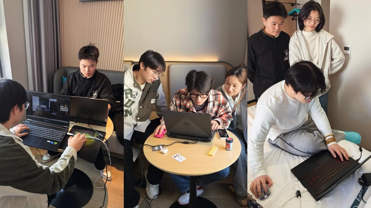 自接到赛项任务书以来,武工院机械系三支队伍便开启“百日冲刺”模式。在指导老师金志尧、闫航瑞、李孝元的带领下,团队深入研读任务书技术细则,针对性制定“三维一体”备赛方案:针对任务书中“多品种混流工艺设计”要求,代表队一创新提出“动态产线平衡算法”,使设备利用率提升18%;代表队二攻克“数控加工仿真误差”难题,通过参数优化将精度控制在0.02mm以内;代表队三则研发“产线故障预警系统”,实现实时诊断响应。团队在实验室中1:1还原了比赛平台,并每天进行长达12小时的沉浸式联调训练。针对任务书中“突发状况处理”要求,设计10余套应急预案,确保比赛零失误。打破传统分工模式,采用“轮岗制”培养全能选手。每周组织跨队技术沙龙,共享虚拟调试经验,形成“技术共同体”。在完成报道程序后,选手们随即投入最终环节的测试与调试工作中,图中所展示的正是他们在酒店内专注调试的场景。