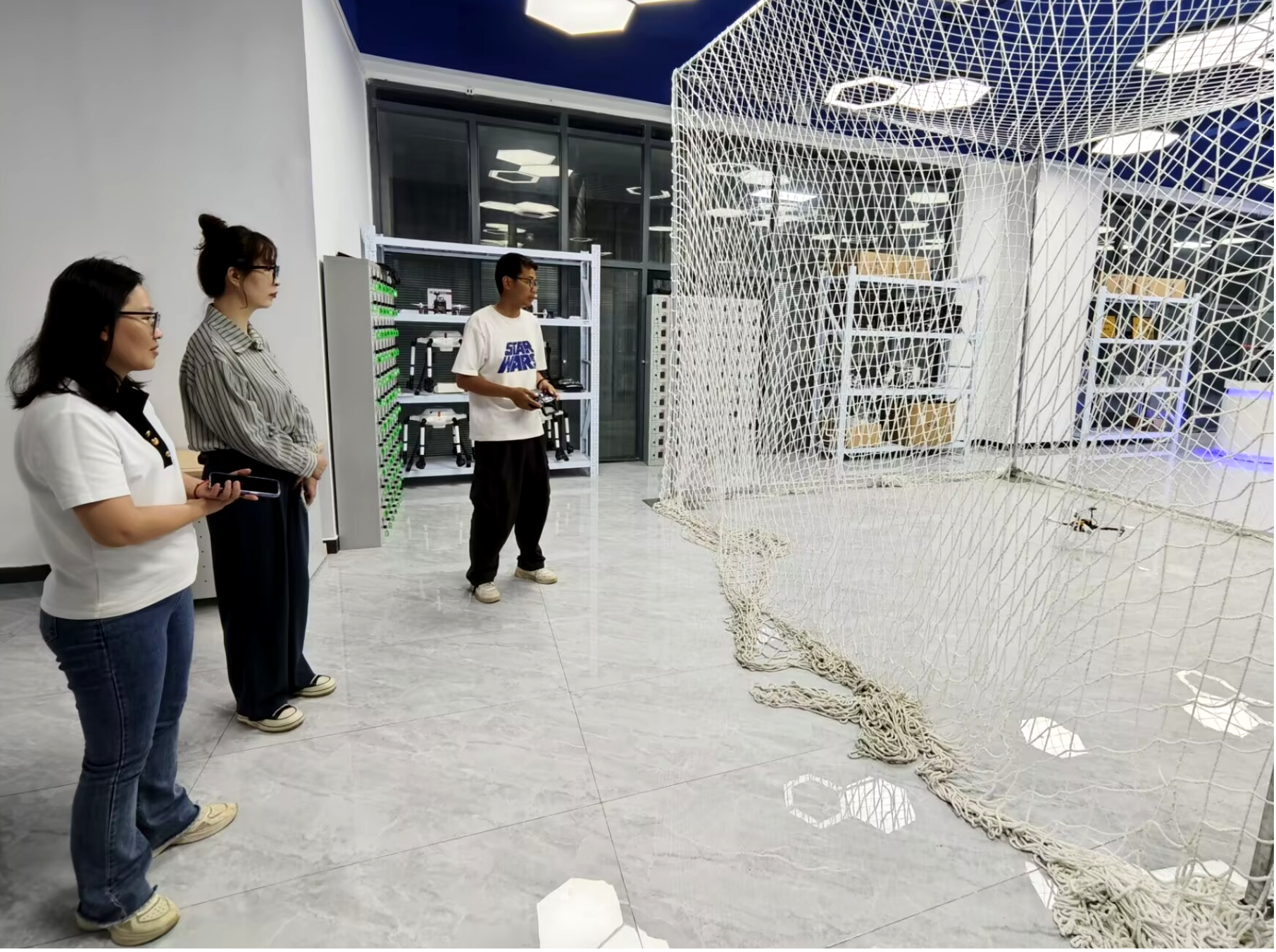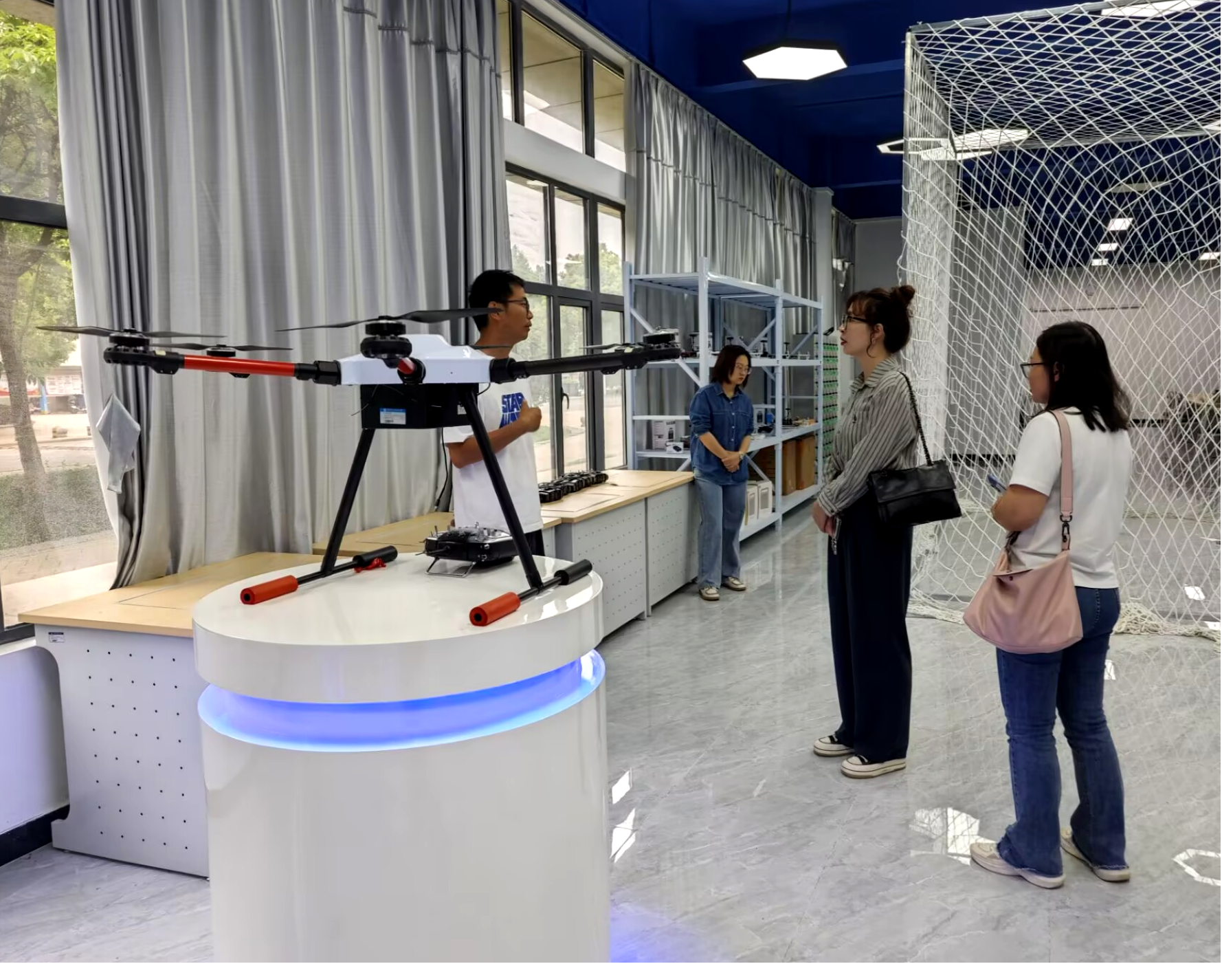 接着调研团队实地考察了湖北国土资源职业学院的相关专业实验室,包括无人机赛训基地和无人机培训基地等,现场观摩了“无人机管理平台仿真飞行”、“无人机试飞”的教学展示。实验室负责人详细讲解了无人机舵机控制、无人机模拟飞行等技术细节,为无人机在农业植保、物流配送及应急救援等场景提供了技术参考。