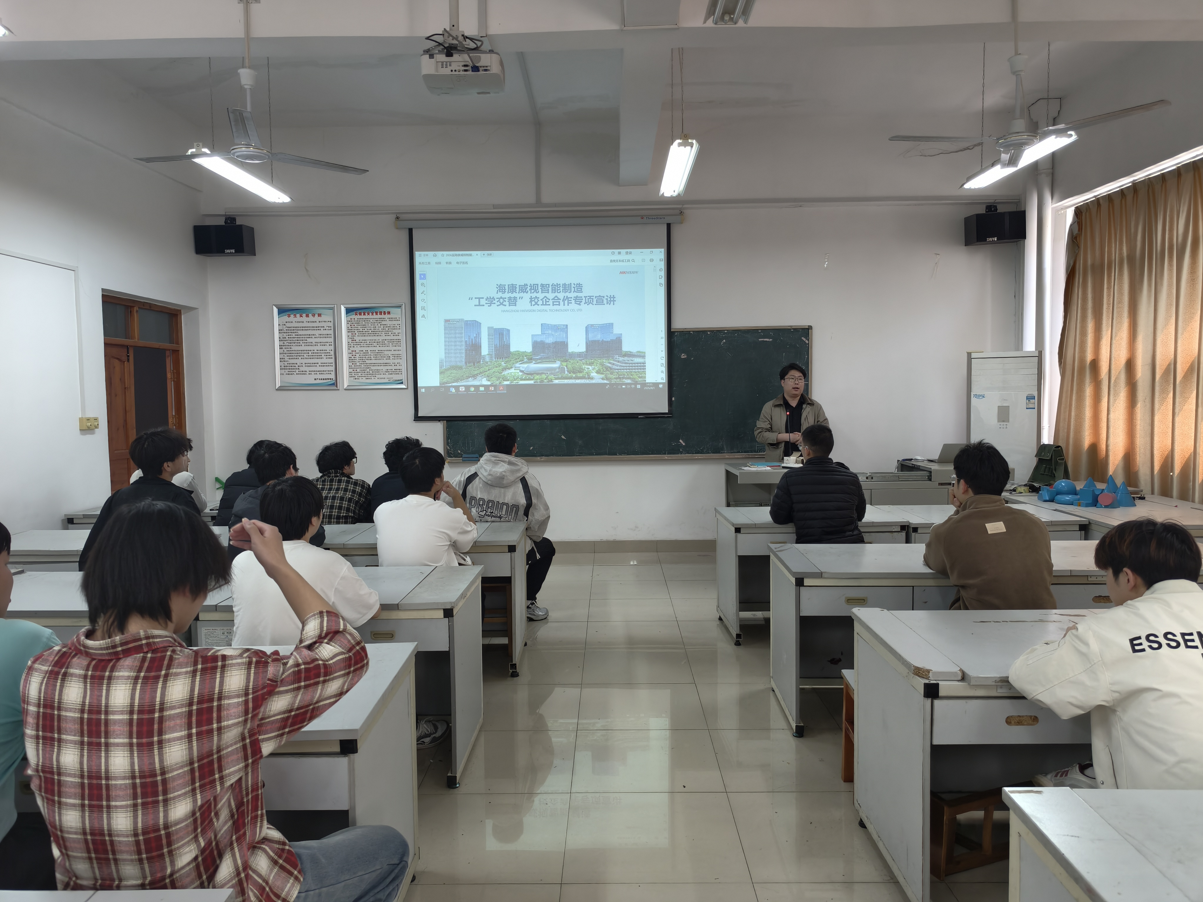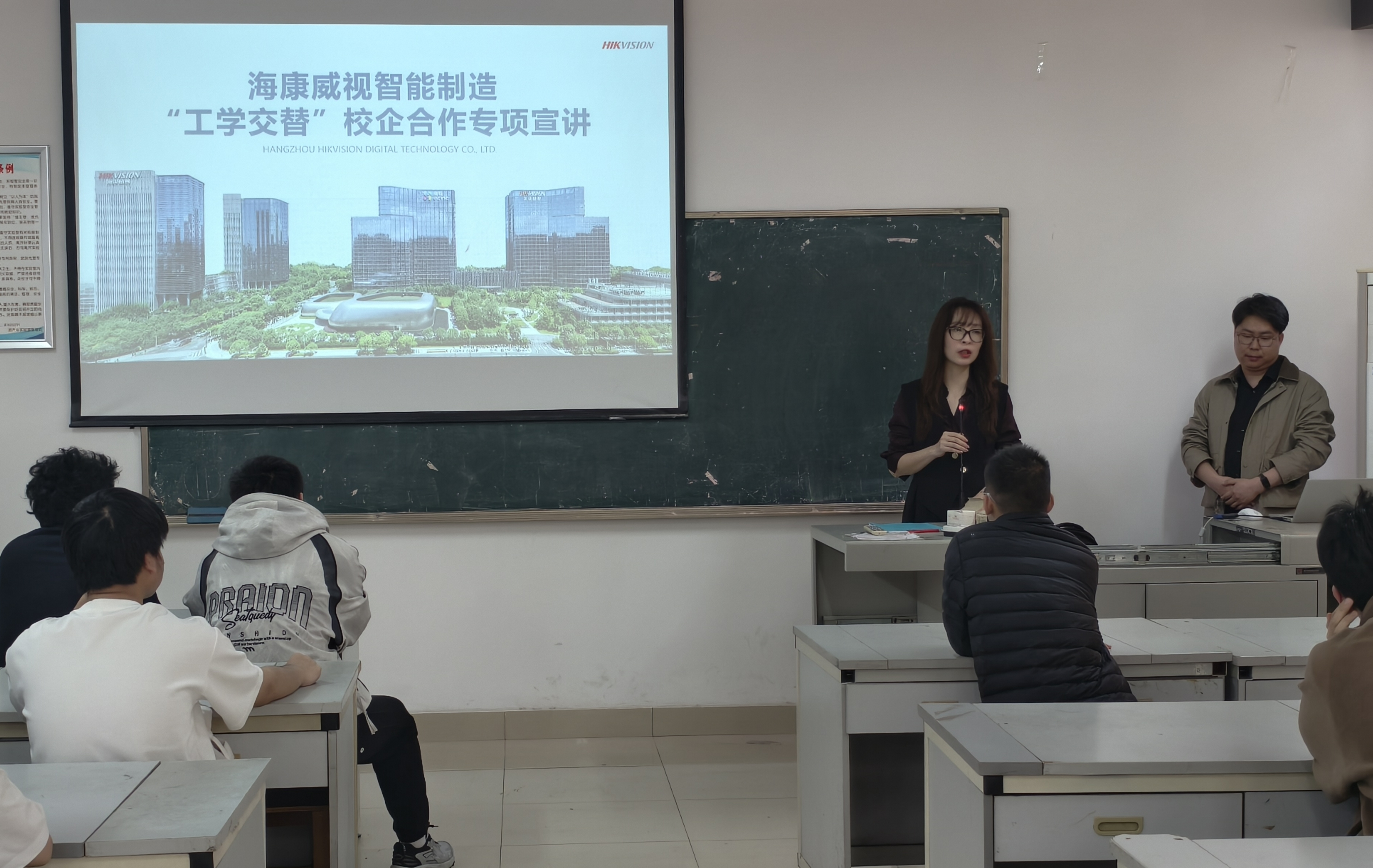 在武汉工程科技学院绿智制造产业学院的支持下,为深化产教融合,创新人才培养模式,精准对接产业需求,学校与全球安防行业龙头企业——海康威视联合举办的“工学交替”项目宣讲会于4月1日下午14时在工程训练中心顺利举行。本次活动面向智能制造与建造学院机电一体化专科专业大二学生,旨在通过校企协同育人机制,打造理论与实践并重的复合型高技能人才培养平台,标志着双方在产教融合领域迈出坚实一步。
